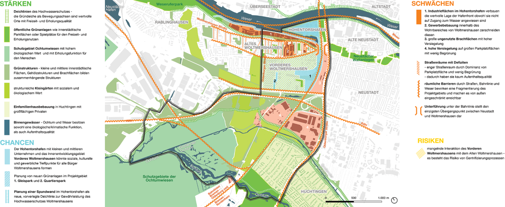 Die Umweltanalyse hat mehrere ökologische Defizite im Projektgebiet identifiziert. Es gibt bedeutende Lücken im Grün- und Freiraumnetz, die die Biodiversität und die ökologischen Funktionen des Stadtteils beeinträchtigen. Bestehende Grünflächen sind oft klein, isoliert und schlecht miteinander vernetzt, was die Schaffung eines durchgehenden grünen Korridors erschwert. Die Industrieflächen im Hohentorshafen und die stark versiegelten Straßenflächen beanspruchen wertvolle Raumressourcen, die ökologisch aufgewertet werden könnten. Diese Flächen könnten durch die Schaffung von neuen Grünflächen und die Renaturierung bestehender Brachflächen zu Lebensräumen mit hoher Aufenthaltsqualität und ökologischer Funktion umgewandelt werden. Die Umweltanalyse hebt die Notwendigkeit hervor, bestehende Grünstrukturen zu stärken und zu vernetzen, um sowohl das städtische Mikroklima zu verbessern als auch die Lebensräume für Flora und Fauna zu erweitern.