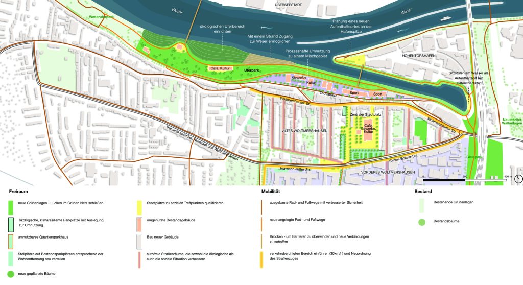Das Freiraumkonzept für den Stadtteil Woltmershausen sieht die Entwicklung eines vernetzten Systems von Grün- und Freiflächen vor, das die Lebensqualität der Bewohner:innen nachhaltig verbessert. Zentrales Element des Konzepts ist die Schaffung eines grünen Korridors, der die Weser, den Alten und den Vorderen Woltmershausen miteinander verbindet. Diese grüne Achse soll isolierte Grünflächen miteinander verknüpfen und gleichzeitig neue öffentliche Räume für Erholung, Begegnung und Bewegung bieten.