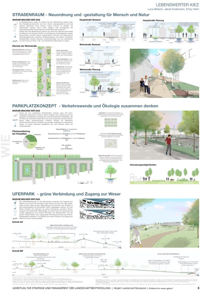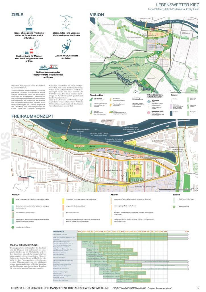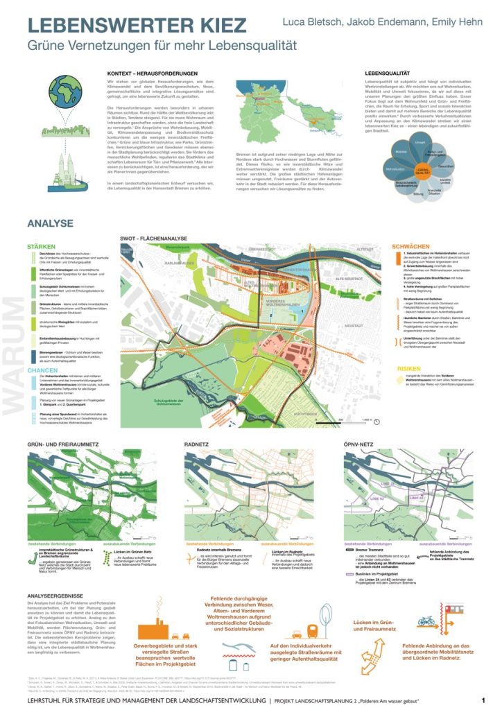 Das Projekt “LEBENSWERTER KIEZ – Grüne Vernetzungen für mehr Lebensqualität” wurde im dritten Semester des Bachelorstudiums der Landschaftsarchitektur und Landschaftsplanung an der Technischen Universität München entwickelt. Das Projektgebiet befindet sich im Bremer Stadtteil Woltmershausen, der aufgrund seiner isolierten Lage und der angrenzenden Industrieflächen mit spezifischen städtebaulichen und ökologischen Herausforderungen konfrontiert ist. Die Hauptaufgabe bestand darin, ein integratives Konzept zur Verbesserung der Lebensqualität zu erstellen, das die Wohnsituation, die Umwelt und die Mobilität in Woltmershausen berücksichtigt. Ausgangspunkt war die Frage: „Wie lässt sich die Lebensqualität für Mensch und Umwelt im Projektgebiet erhöhen?“ Im Rahmen dieses Projekts wurde eine umfassende Analyse durchgeführt, gefolgt von der Entwicklung einer Vision, einem Freiraumkonzept und spezifischen Maßnahmen zur nachhaltigen Verbesserung des Stadtteils.