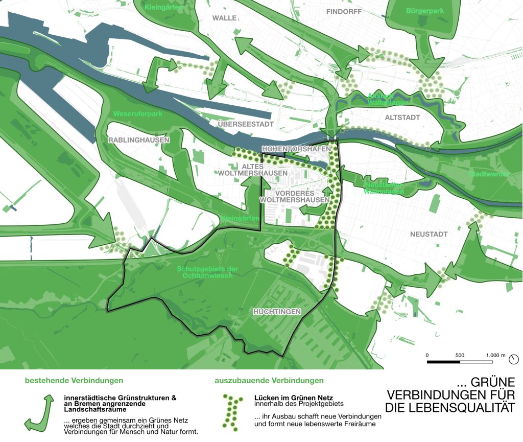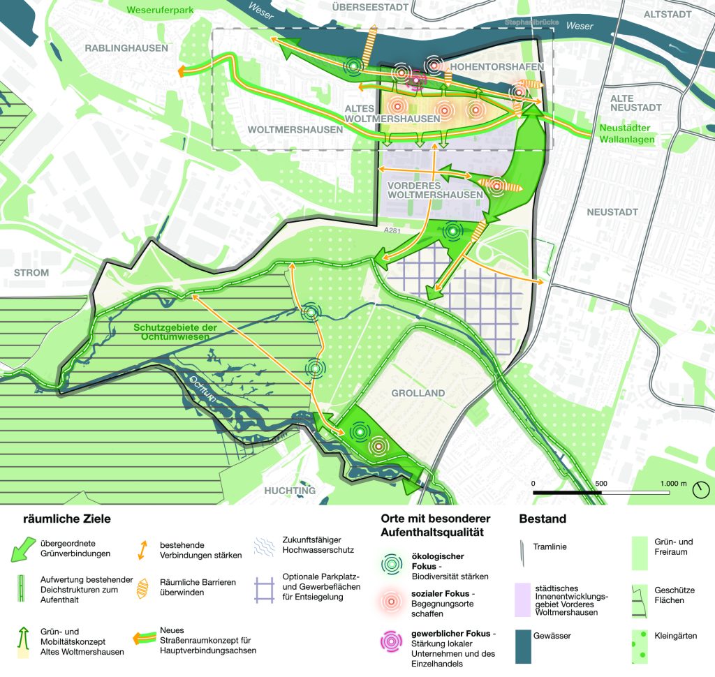 Die Vision des Projekts ist es, den Stadtteil Woltmershausen in Bremen zu einem lebenswerten und zukunftsfähigen Stadtteil zu entwickeln. Ziel ist die Schaffung eines gut vernetzten Grün- und Freiraumnetzes, das die Weser, den Alten und den Vorderen Woltmershausen miteinander verbindet und neue Erholungs- und Begegnungsräume bietet. Durch die Begrünung und Neugestaltung von Straßenräumen sowie die Reduzierung versiegelter Flächen sollen sowohl die Aufenthaltsqualität als auch die ökologische Funktionalität des Stadtteils erhöht werden.