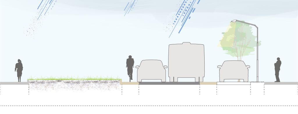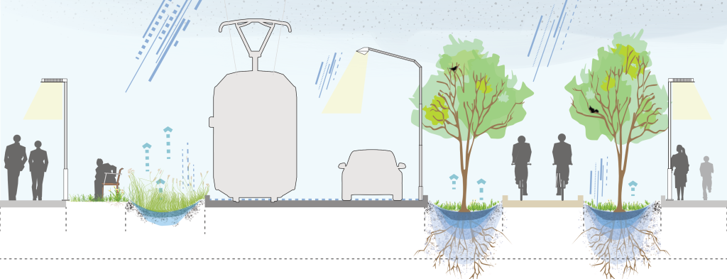 Installation von Baumrigolen und Verdunstungs- und Filterbeeten zur Verbesserung des Regenwassermanagements, Reduzierung von Hitzeinseln und Reinigung des Straßenabwassers.