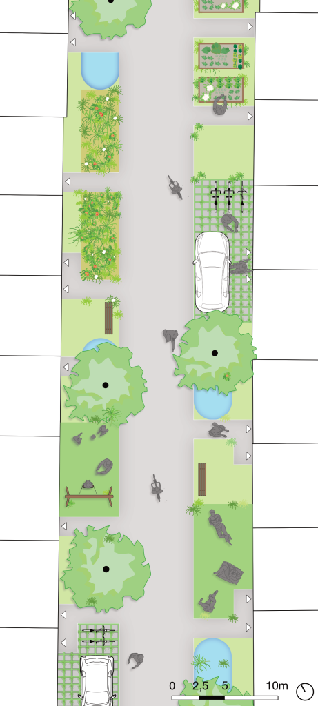 Diese Flächen innerhalb der Wohnstraßen sind für die aktive Nutzung und Gestaltung durch die Anwohner:innen vorgesehen. Sie ermöglichen es den Bewohner:innen, ihre Umgebung entsprechend ihrer Bedürfnisse und Interessen zu gestalten, was den sozialen Zusammenhalt, die kulturelle Vielfalt und das städtische Leben fördert.