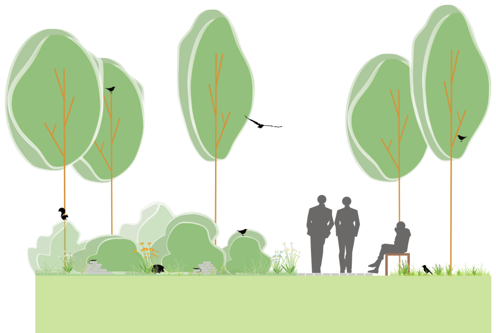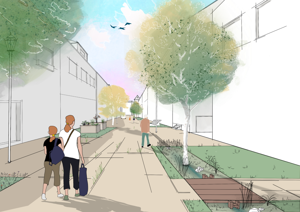 Um die Aufenthaltsqualität zu erhöhen, werden stark versiegelte Straßenräume in verkehrsberuhigte Zonen umgewandelt, die Platz für Fußgänger:innen, Radfahrer:innen und urbane Begrünung schaffen. Neue Grünflächen entlang der Hauptverkehrsstraßen, die Umwandlung von Parkplätzen in grüne Erholungsräume sowie die Einrichtung von Gemeinschaftsgärten sollen die ökologische Vielfalt fördern und zur Verbesserung des städtischen Mikroklimas beitragen. Darüber hinaus werden Retentionsflächen zur Wasserrückhaltung angelegt, um den Auswirkungen des Klimawandels entgegenzuwirken und die Resilienz des Stadtteils zu stärken.