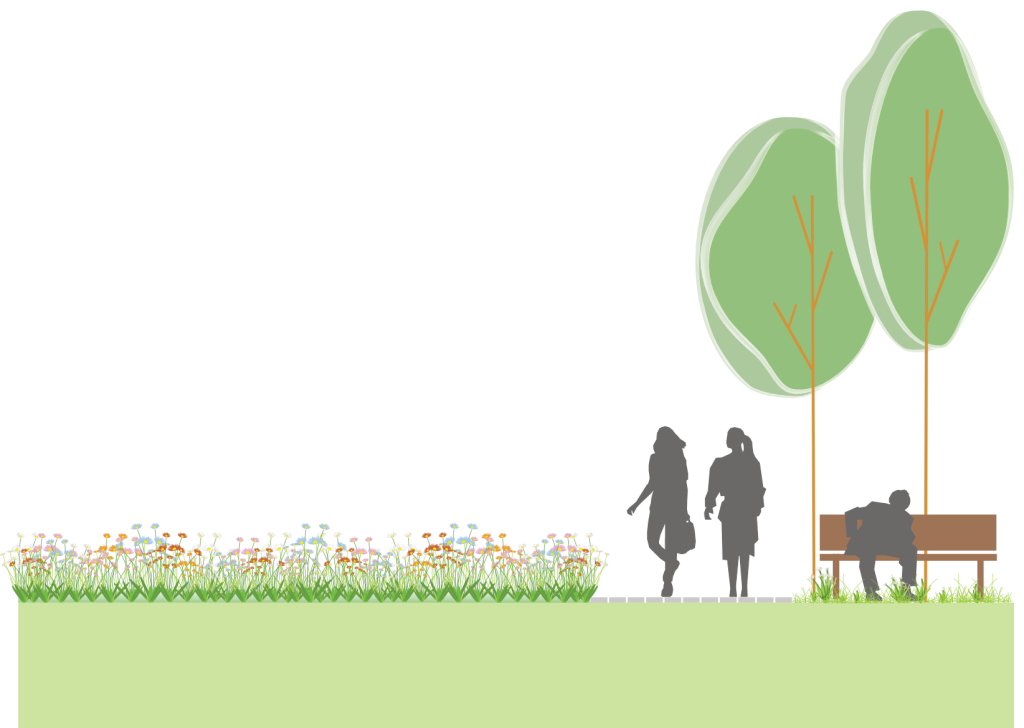 Bepflanzte Versickerungsmulden und Baumrigolen erweitern den Straßenfreiraum um ein blaues Element. Diese Retentionselemente helfen bei der Regulierung des Stadtklimas durch Wasserrückhalt und Verdunstungseffekte, unterstützen das Regenwassermanagement und tragen zur Reduktion von Problemen bei Starkregenereignissen bei. Zusätzlich verbessern sie das Mikroklima und bieten ökologische Funktionen wie Nistmöglichkeiten und Nahrungsquellen für Tiere.